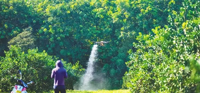 7月25日,澄邁縣福山鎮,海南橡膠紅光分公司智能標準化澄邁福橙種植基地,伴隨著螺旋槳轉動的嗡嗡聲,一臺無人機滿載生物防蟲劑緩緩升空,按照預設航線在福橙園上空來回穿梭。